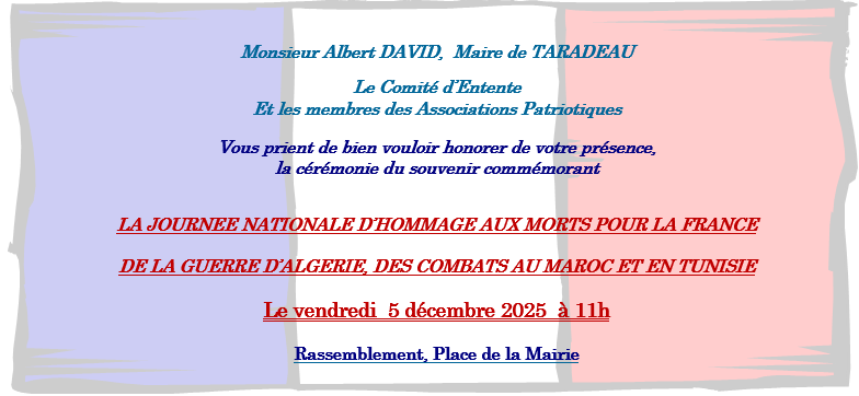 3 décembre 2025 Vie Communale Cérémonie du 5 décembre Précédente Week-end du Téléthon à Taradeau – programme du 7 décembre avec les Country Free Dancers Prochaine Week-end du Téléthon à Taradeau – vente de soca et ballades à dos d’ânes