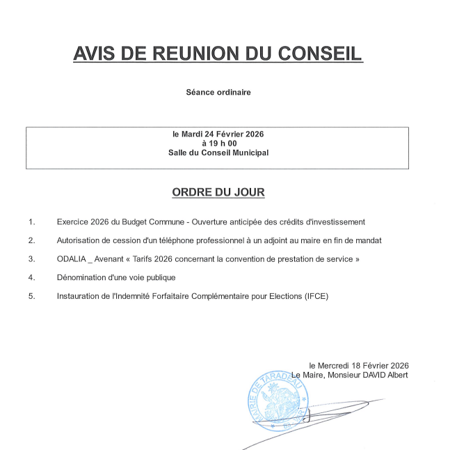 19 février 2026 Conseil municipal‚ Vie Communale Conseil Municipal le mardi 24 février Précédente Nouveau à Taradeau SERVICES ET CLAIRE