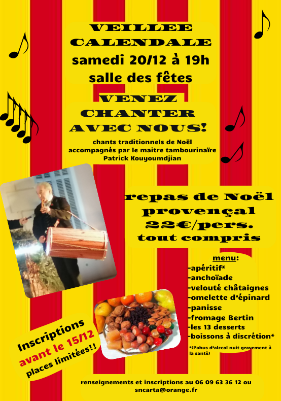 La soirée se composera d’un repas traditionnel de veille de Noël en Provence.
